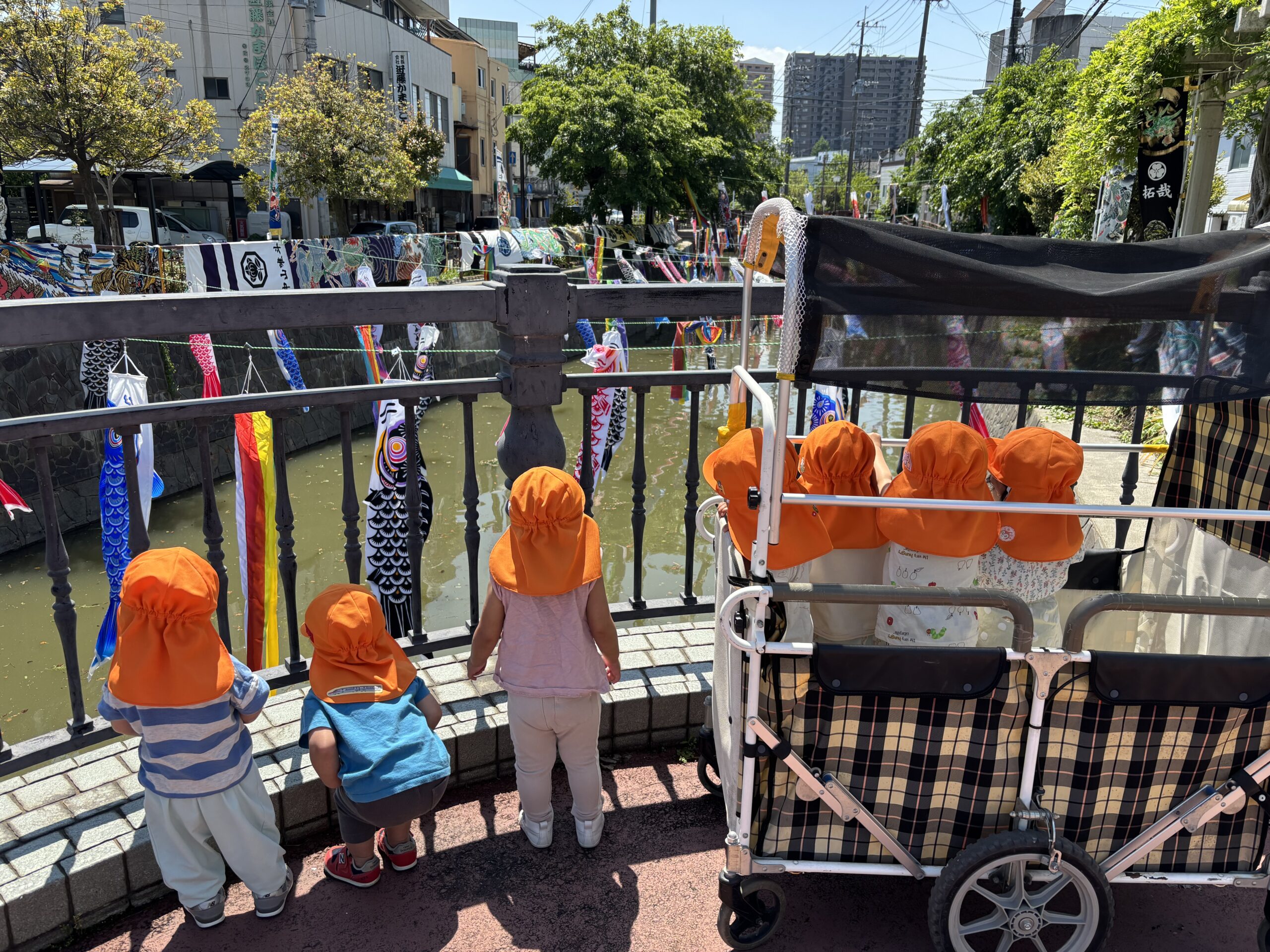 当園では、主活動の中にお散歩を取り入れています。戸外の空気や動植物に直接触れ、思う存分遊び、運動することにより発達を促していきます。また、季節を感じることで自然への関心と認識を深め、仲間関係も深めていきます。小学校の登下校に必要な交通ルールも学びます。