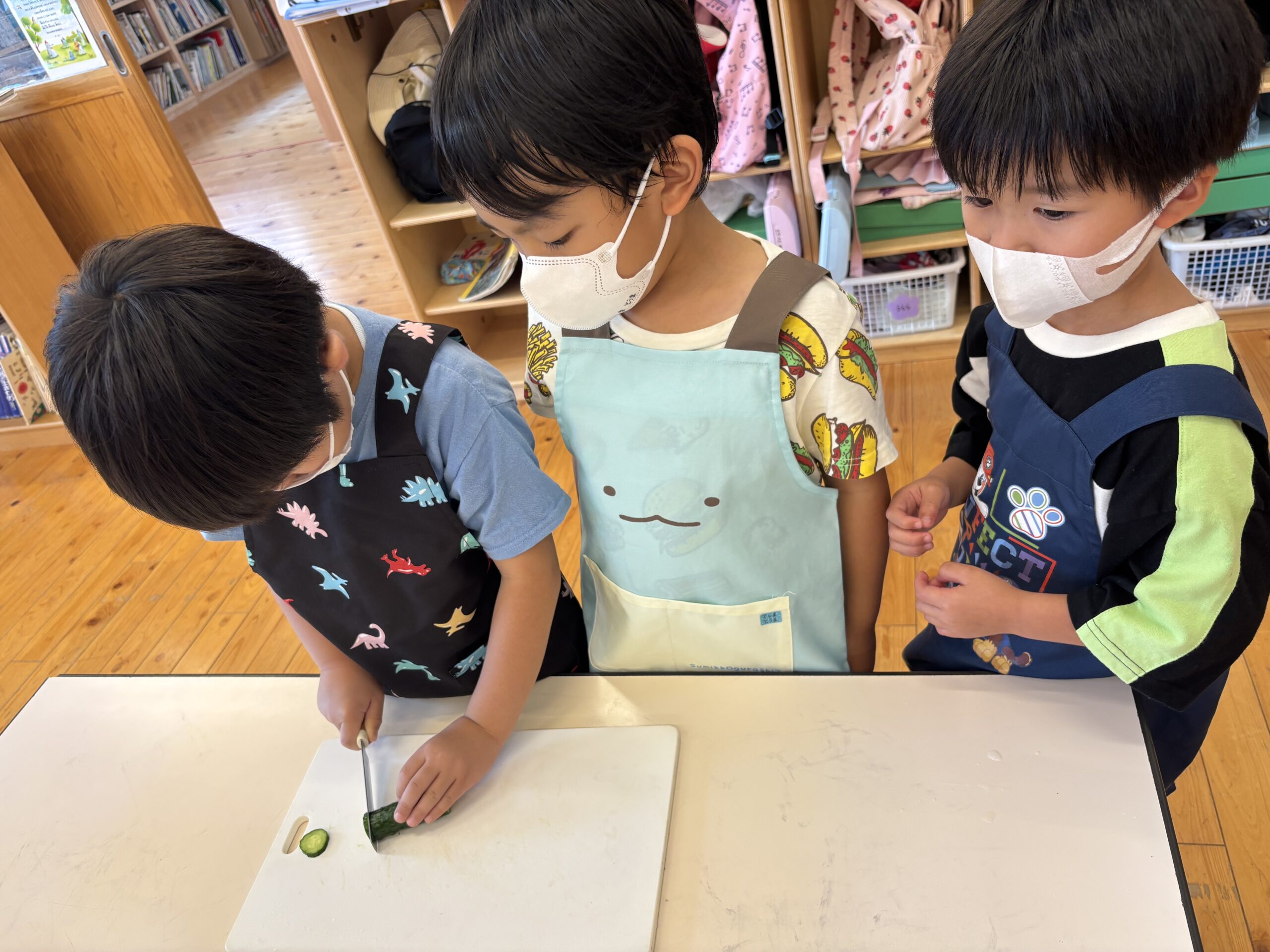 食材を知り、食べることや作ることに興味を持てるよう、クッキングを行っています。野菜やイモなどの収穫から始まり、収穫した旬の食材を調理して食べるので感動も倍増。さらに、収穫から調理まで食べ物に触れることで、食べることが出来る感謝の気持ちを持てるようになります。先生方の指導の元、包丁を使いクッキングのスキルを高めていきます。