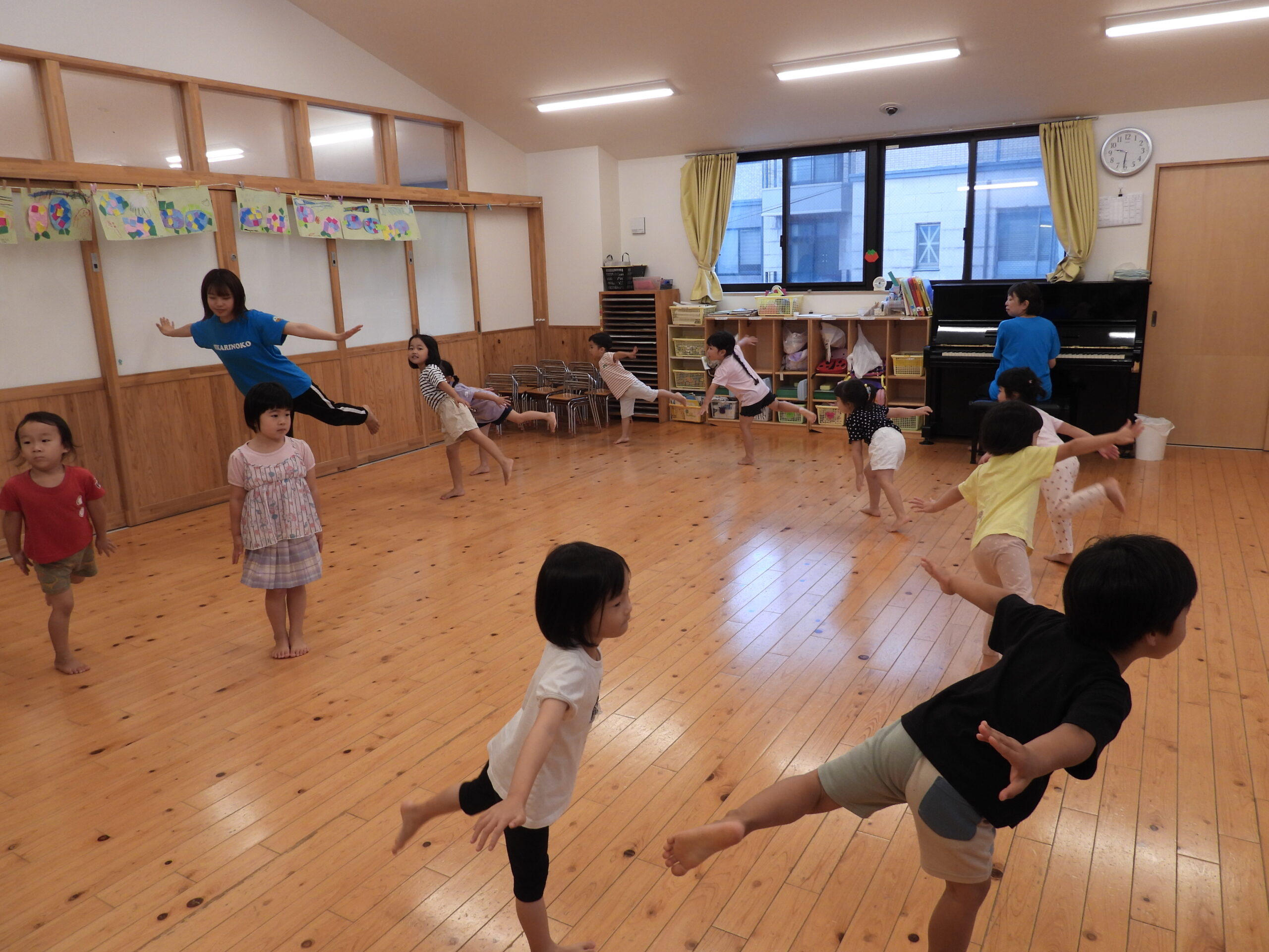幼稚園では、ピアノの音に合わせて全身を使って動き回るリズム運動を行っています。ピアノの音を聞き分け、テンポの変化に気づいたりすることで子どもたちの自主性や考える力が育ちます。「指示」や「号令」をしない、自分で考えて動くリズム遊びが子どもたちは大好きです。0, 1歳の子どもたちもお兄さんお姉さんたちの姿を見て自然に身体が揺れ動き、そして懸命に模倣(まね)をし始めます。